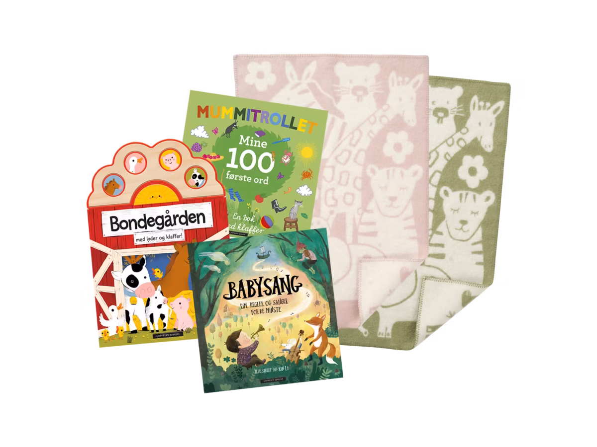 Bli medlem i Barnas Egen Bokverden og få en flott velkomstgave med et Klippan babyteppe med søtt dyremønster i organisk lammeull og tre babybøker – totalverdi 1336 kr!