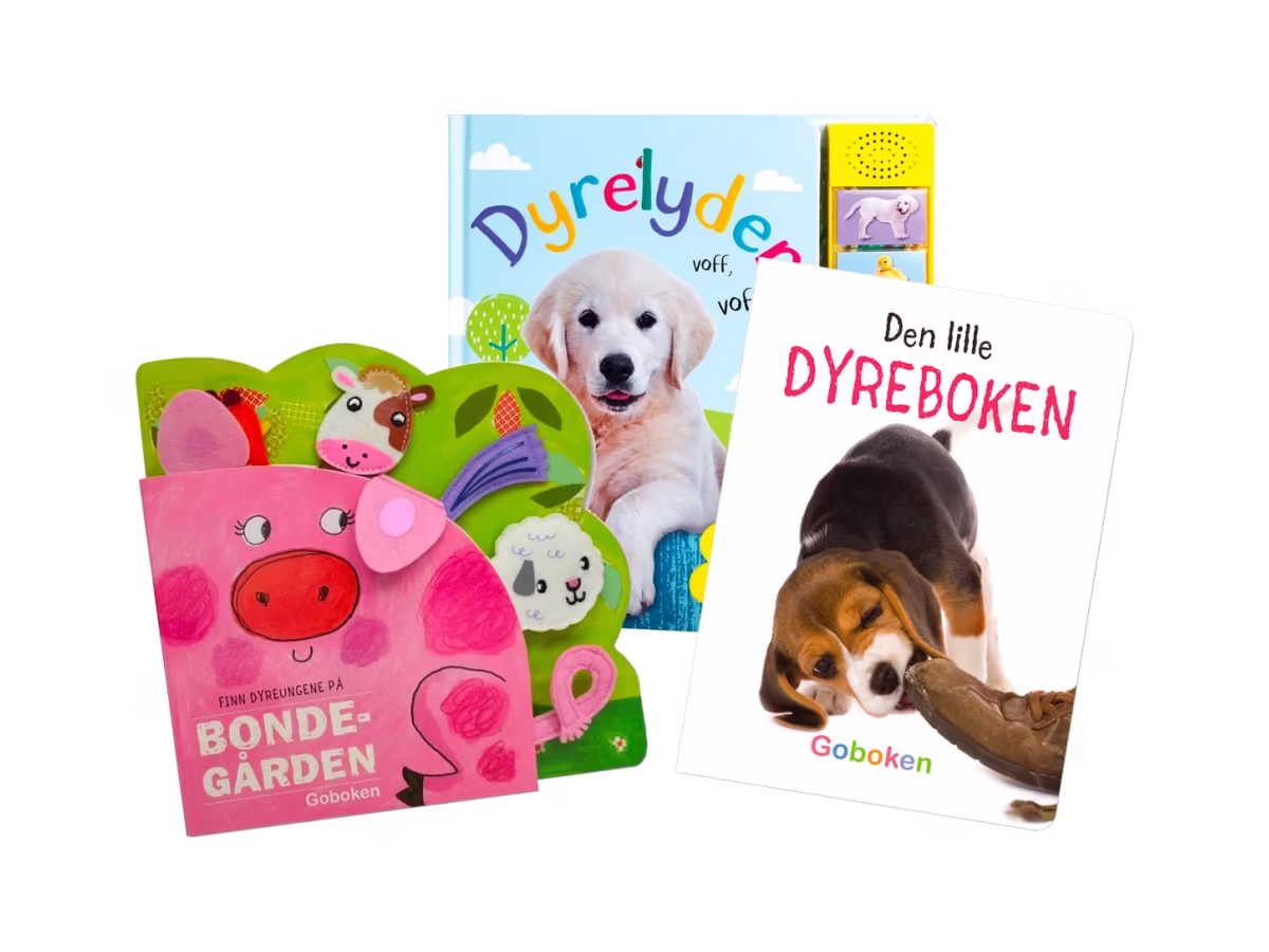 Barn elsker dyr. I denne velkomstpakken fra Goboken får barnet ditt Dyrelyder, Den lille dyreboken og Finn dyrene på bondegården.