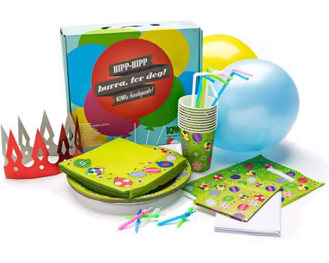 Bursdagsesken inneholder det du trenger for å arrangere en barnebursdag for 10 personer: invitasjoner, bursdagskrone, tallerkener, kopper, servietter og sugerør.