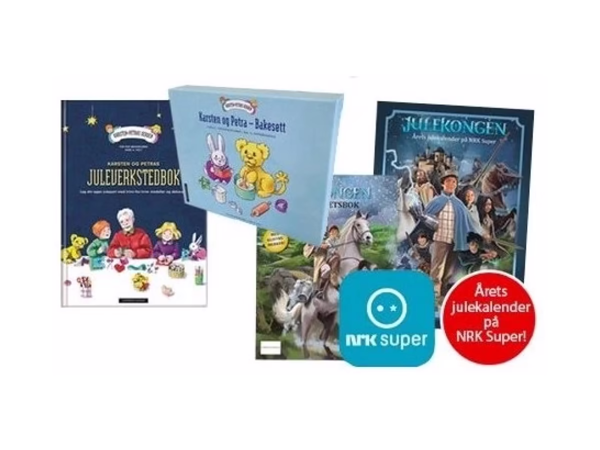 Få en gratis NRK julekalenderpakke med Julekongen julekalender, Julekongen aktivitetsbok, Karsten og Petras juleverksted og Karsten og Petra bakesett fra Barnas Egen Bokverden.