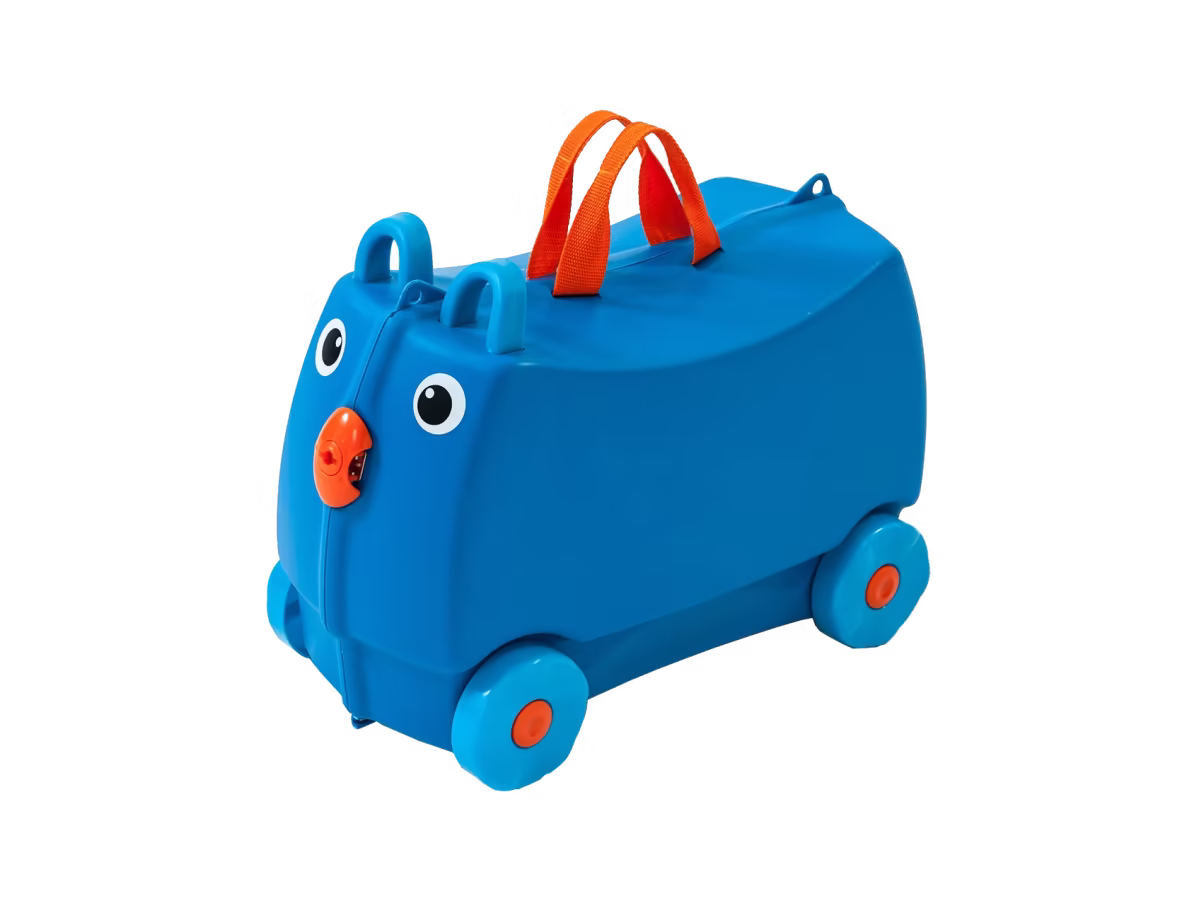Fin og fargerik koffert fra Trotter, med morsomt ansikt og justerbar stropp. Stroppen kan henges over skulderen eller brukes til å dra kofferten mens barnet sitter på.